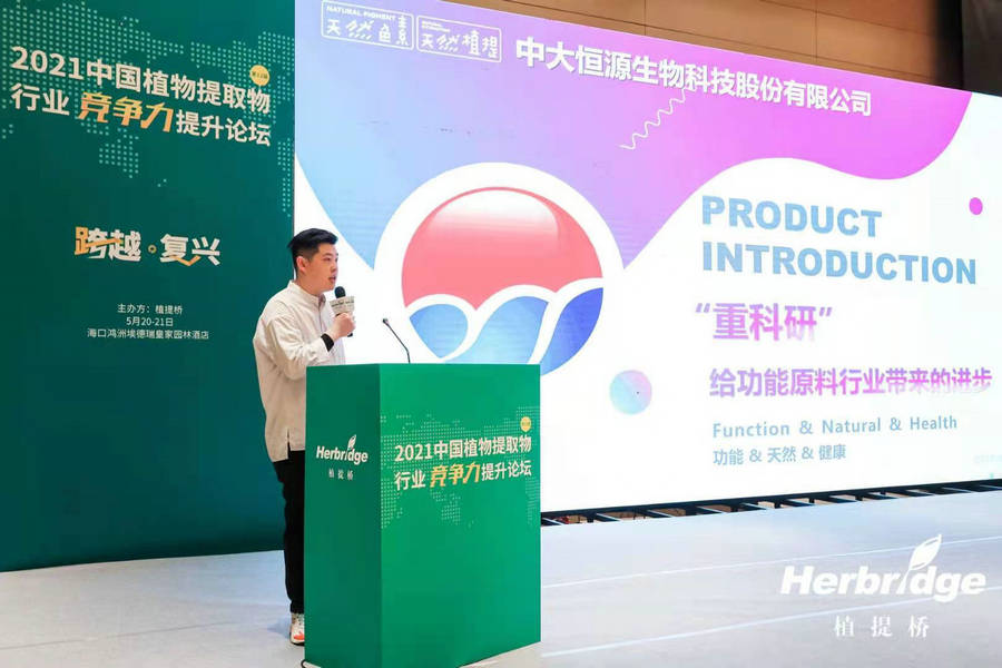 On May 20-21, 2021, the 12th China Plant Extract Industry Competitiveness Enhancement Forum was held in Haikou. Henan Zhongda Hengyuan Biotechnology Stock Co., Ltd. Sales General Manager Jin Ziheng was invited to participate in the forum and made a " The keynote speech of "High Technology" Brings Progress to the Functional Material Industry" attracted widespread attention from the participants.
